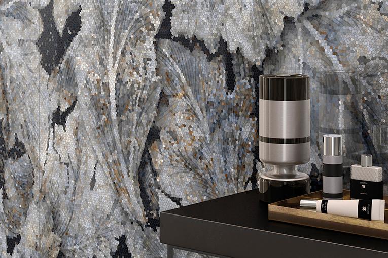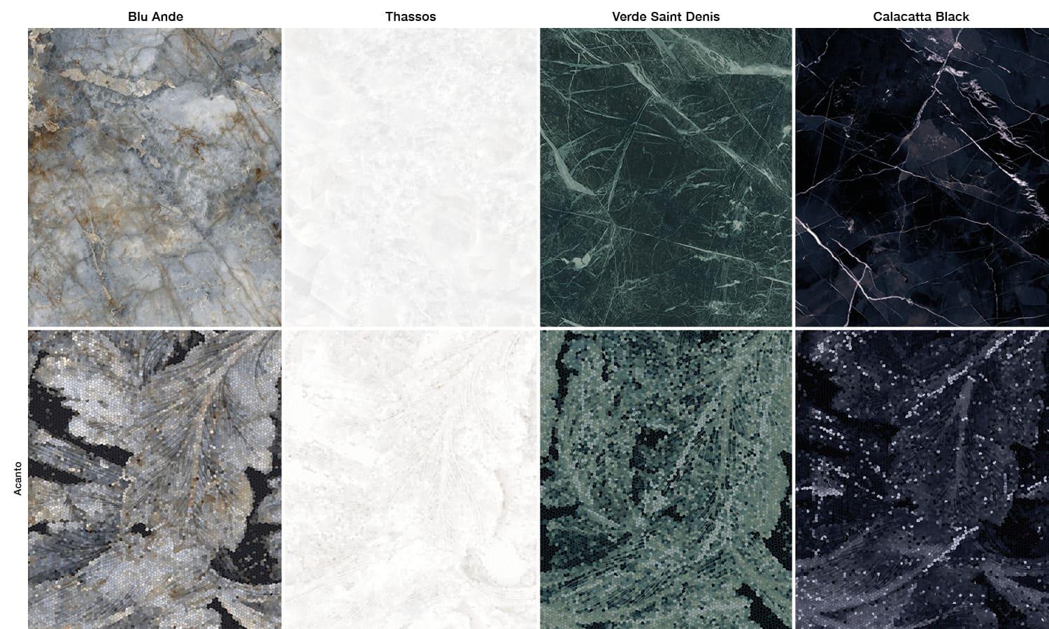 Sie führt neue Farben und ungewohnte Kombinationen zur Betonung der Ausdruckskraft ein: Thassos, Calacatta Black, Verde Saint Denis, Blu Ande. Vier neue Marmoroptiken in den Ausführungen natürlich und geläppt finden ihren maximalen Ausdruck in den großformatigen Platten. Ausgehend von Studien zu innovativen Farb- und Designlösungen setzt Tele di Marmo Revolution neue Maßstäbe in der zeitgemäßen Marmorinterpretation und ergänzt das Sortiment mit dem Dekor Acanto. Hier zeigt sich durch klare und sehr ausgewogene Geometrien in den Tönen und Details die Anknüpfung an kunstvolle Mosaike. Diese attraktive Dekoration macht das Konzept Tele di Marmo Revolution zu einer vollendeten Lösung für Boden- und Wandverkleidungen. Äderungen, Reflexe und Details sorgen für einzigartige Akzente, deren starke Wirkung jedes Projekt wie ein ästhetisches Kunstwerk prägen. Mosaike runden die Kollektion ab und eröffnen vielseitige Verlegemöglichkeiten.