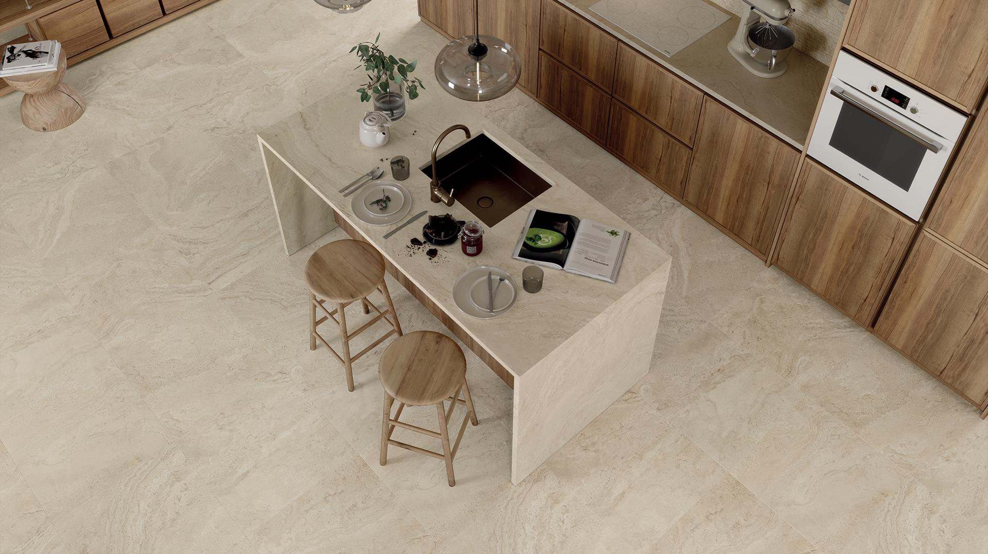 Hinsichtlich der Bodenbeläge ist die brandneue Serie Unique Travertine by Provenza ein passendes Beispiel für eine äußerst gelungene Verbindung von klassischem Material und moderner Projektflexibilität. Das von Travertingestein inspirierte Bodenfliesenprojekt umfasst vier neutrale Farbtöne und vier Oberflächen, die das Materialbild des Steins aufgreifen. Charakter und Farbvielfalt machen sie zu einer besonders vielseitigen Kollektion, die sich ebenso perfekt für die Kombination mit eher rustikalen Möbeln und Einrichtungselementen aus Holz wie mit modernen Interieurs eignet.