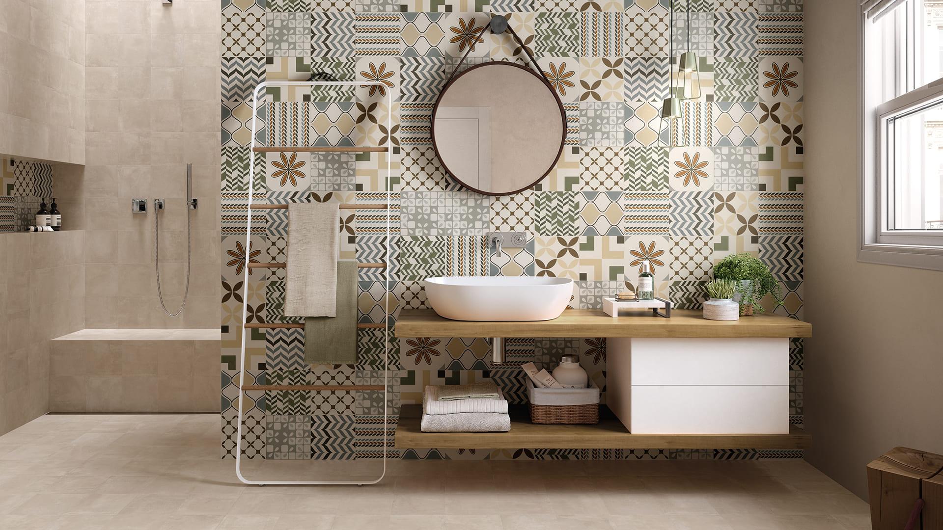 In Hinsicht auf den Mix unterschiedlicher Stile möchten wir Sie auf eine Fliesenkollektion aufmerksam machen, deren Elemente zu reizvollen Wandbelägen und Flächenbildern kombiniert werden können. Die Rede ist von Be-Square by Emilceramica, deren puristische Betonoptik mit abwechselnd matten und glänzenden Partien einen großen Freiraum bei Farb- und Gestaltungskombinationen lässt. Eine Farbpalette mit vier Farben - Black, Concrete, Ivory und Sand - passt ausgezeichnet zu den Zementfliesen mit wellenartigen und geometrischen Mustern. Sie können beispielsweise Fliesenpatchworks gestalten, die Unifarbe mit schwungvollen Dekoren mixen, oder mit den gemusterten Fliesen nur einen bestimmten Bereich wie etwa die Duschnische akzentuieren.