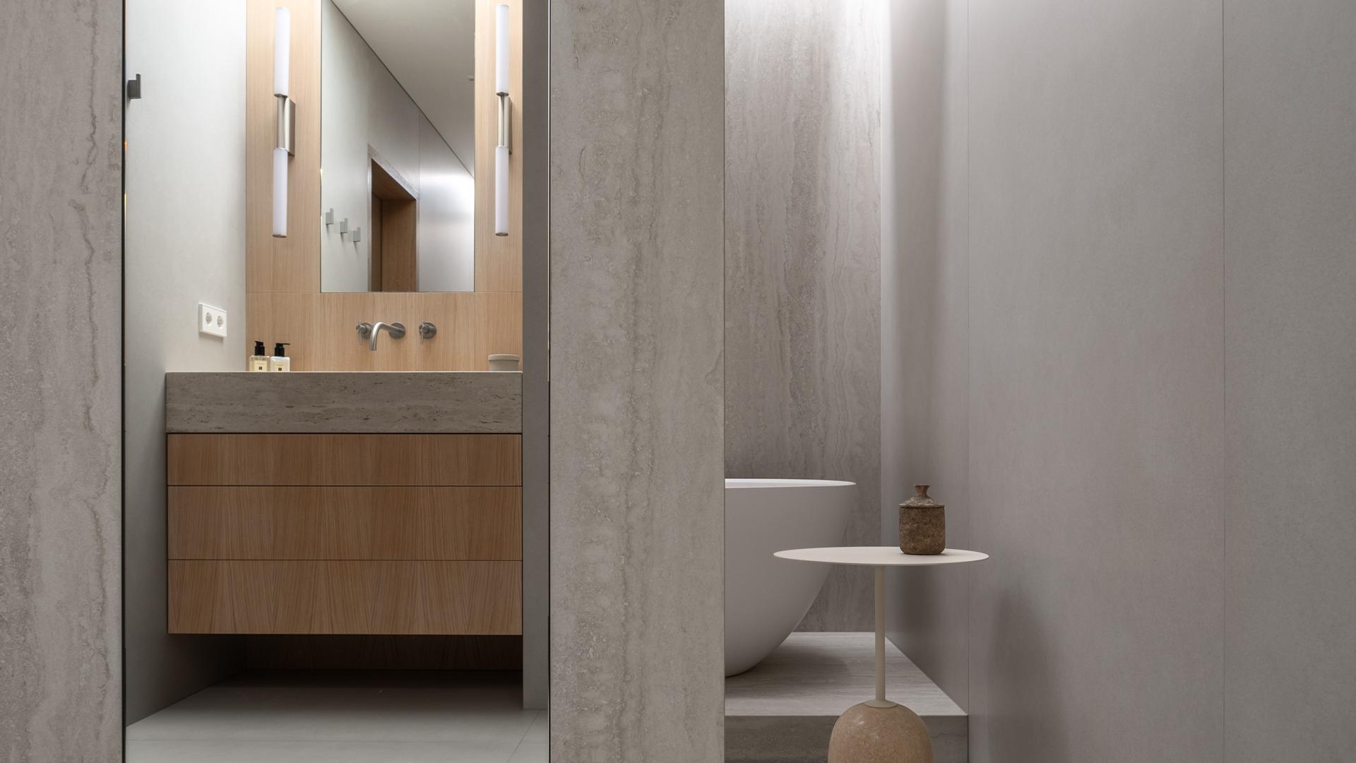 Im Bad wurden auch einige warme Materialien verwendet, wie z. B. Eiche, die einen schönen Kontrast zum Travertin und den Fliesen in Zementoptik bildet.