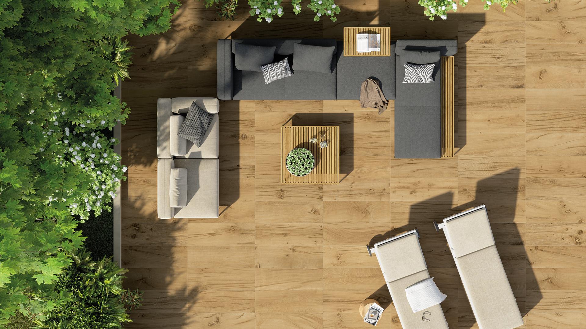 Auch 2023 verstärkt sich der Trend, die eigenen Wohnräume in die Außenbereiche zu verlängern, mit elegant gestalteten Terrassen und üppigen Gärten. Die Außenbereiche werden regelrecht zu Architekturelementen, die Immobilien bereichern, in denen sich der Einrichtungsstil spiegelt und die durch naturnahes Design eine dialogische Verbindung zur Außenwelt schaffen. Und so finden sich Flächenbeläge in Grüntönen, die an Gras oder Landschaften erinnern – grüne Bodenbeläge in den verschiedensten Nuancen, die zum Ausgangspunkt für offene und lichtdurchflutete Terrassen werden. Fliesen mit Farbnuancen wie Sabbia, Salvia oder Fango (Sand, Salbei oder Schlamm) aus der Kollektion Sixty by Emilceramica sind das perfekte Beispiel für nach außen gewandte Gestaltungskonzepte. Alternativ kann für den Dialog nach außen die natürliche Ausstrahlung von Recyclingholz der Kollektion Revival by Provenza eingesetzt werden: Sie thematisiert das Recycling eines edlen Materials und stellt die grüne Natur in den Mittelpunkt. Balkone und Terrassen bieten den Ausblick auf die Natur und sind auch in der Stadtwohnung eine willkommene Möglichkeit, zwischendurch an die frische Luft zu gehen. Grüne Flächenbeläge oder Beläge mit der natürlichen Faszination von Holz sind die ideale Basis für Bereiche, wo man an einem Sonntagnachmittag die Sonne genießt oder auf die Lichter der Stadt blickt. Und mit Fliesen, die – wie bei den Kollektionen Sixty by Emilceramica und Revival by Provenza – Rippen oder Erhebungen haben und damit unseren Tastsinn ansprechen, lässt sich ein ganz besonderes Stückchen Natur schaffen, das uns zu Füßen liegt.