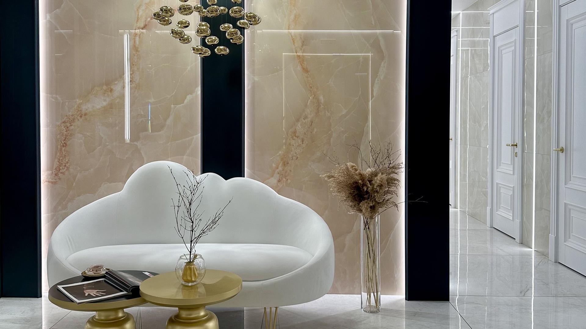 Tele di Marmo Onyx in den Farben Rosa und Avorio (Elfenbein) erinnern an den frühen Morgen, an Morgendämmerung, Erneuerung und an den kostbaren Luxus natürlicher Farbtöne. Das ist der Hauptgrund, warum ich mich für die Kollektion von Emilceramica entschieden habe.