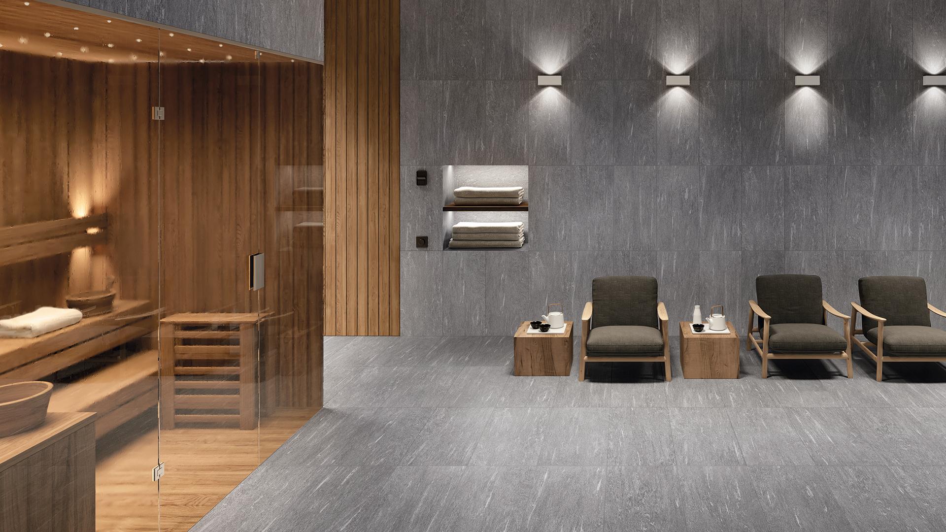 Eine dritte für Bodenbeläge in Natursteinoptik typische Farbe ist Schiefer. Diese hochaktuelle Farbe ist perfekt für eine Vielzahl von Anwendungsbereichen: Sie verleiht Wohnzimmern wie auch Lokalen, Restaurants oder Geschäften starke Ausstrahlung. Die schwarzen Schieferfliesen des Feinsteinzeugs in Natursteinoptik eignen sich sowohl für Außen- als auch für Innenbereiche öffentlicher wie privater Gebäude. Es ist eine beruhigend und elegant anmutende Farbe, auf der Mitte zwischen sehr dunklem Schwarz und Grau, die sich perfekt mit beige-, creme- oder sandfarbenen Einrichtungselementen, aber auch solchen in sehr hellen Grün- und Blautönen kombinieren lässt. Eine besondere Eigenschaft von Feinsteinzeug in Natursteinoptik in der Farbe Schiefer ist zudem, dass ihre Nuancen eine angenehm entspannende, wohltuende und sogar konzentrationsfördernde Wirkung haben.