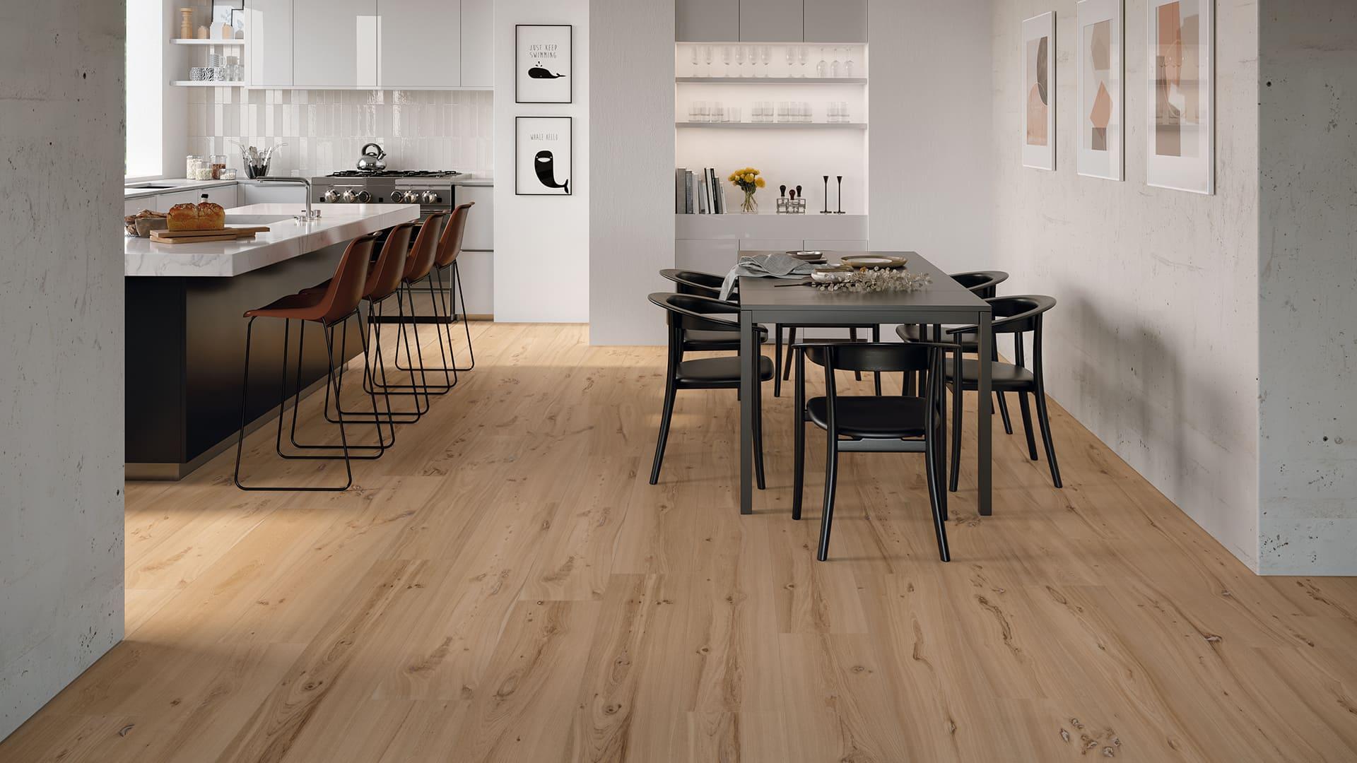 Natürlich will auch das Auge nicht zu kurz kommen. Und wenn Sie sich noch im Unklaren sind, was die funktionalen und vor allem die ästhetischen Aspekte betrifft, müssen Sie bei Holz für Ihre Küche mit Vor- und Nachteilen rechnen. Der größte Nachteil könnte sein, dass eine Küche mit Holzfußboden eine altmodische Ausstrahlung hat und erdrückend wirken kann, was von vielen Faktoren und nicht zuletzt von der Anordnung Ihrer Räume abhängt. Aber auch in diesem Fall kann Feinsteinzeug ein Ass im Ärmel sein: seine Vielseitigkeit beruht nicht nur auf den Vorzügen und technischen Besonderheiten, sondern auch auf seinem großen Angebot an Formaten und Farben, die sich perfekt allen Räumen, Anordnungen und Lichtverhältnissen anpassen. Fliesen in Holzoptik der Emilgroup eignen sich zur Gestaltung Ihrer Traumküche und eröffnen unbegrenzte Möglichkeiten.