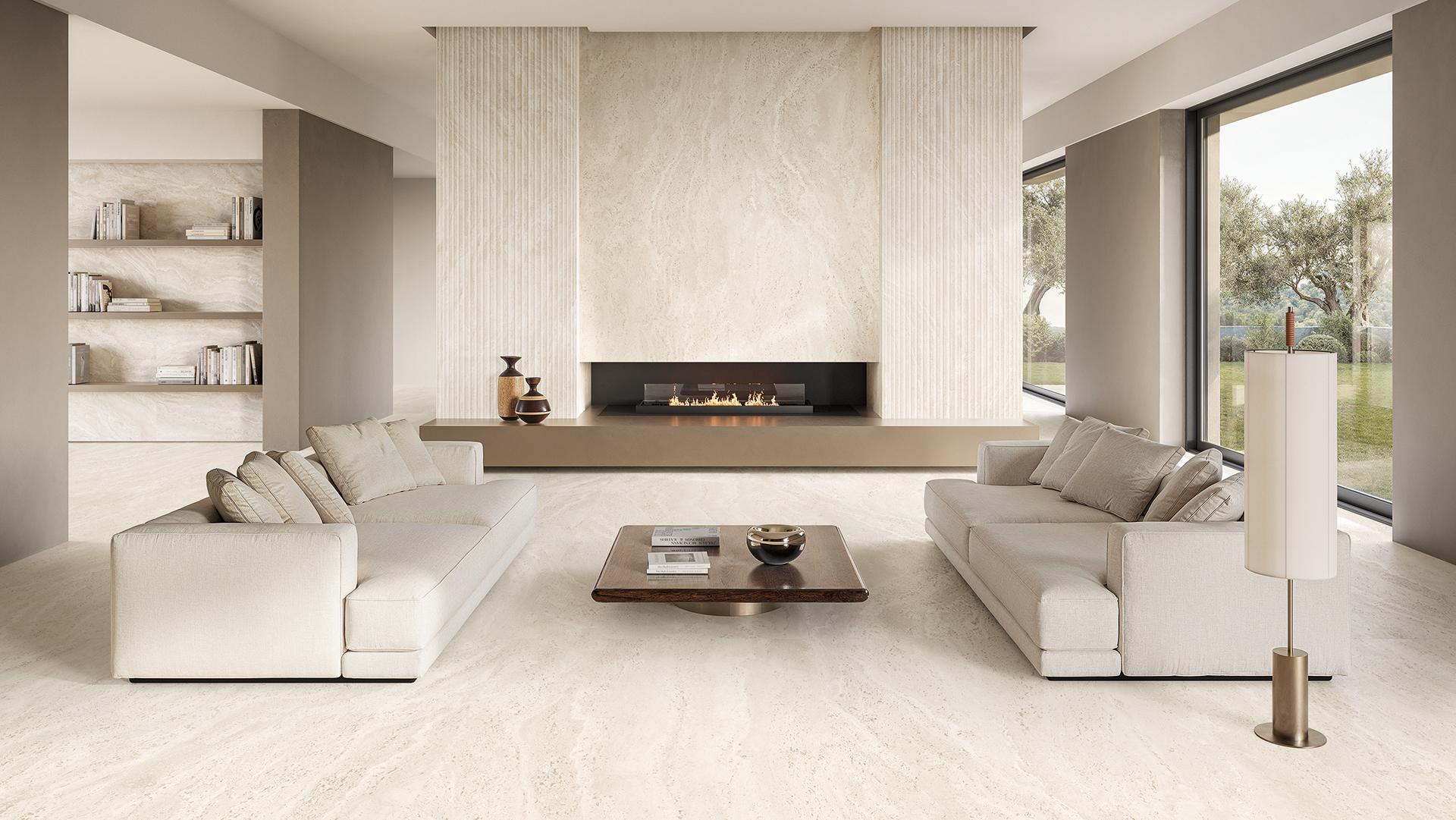 In modernen Interieurs verleiht der Kamin dem Raum Charakter, ohne ihn zu überladen. Die Verwendung des gleichen Materials für mehrere Belagflächen (Kamin, Wände, Fußboden) erzeugt einen stimmigen Dialog. Die Abstimmung der Wandverkleidung auf die Bodenbeläge aus Feinsteinzeug verstärkt das Gesamtresultat. Die Kollektion Dual Travertine by Emilceramica, die gegen das Lager geschnittenen Travertin interpretiert, eignet sich hervorragend für ein solches Konzept. Sowohl für den Kaminbereich als auch für die Akzentwand eingesetzt, erzeugt sie eine visuelle Kontinuität, die den Raum größer und weitläufiger wirken lässt.