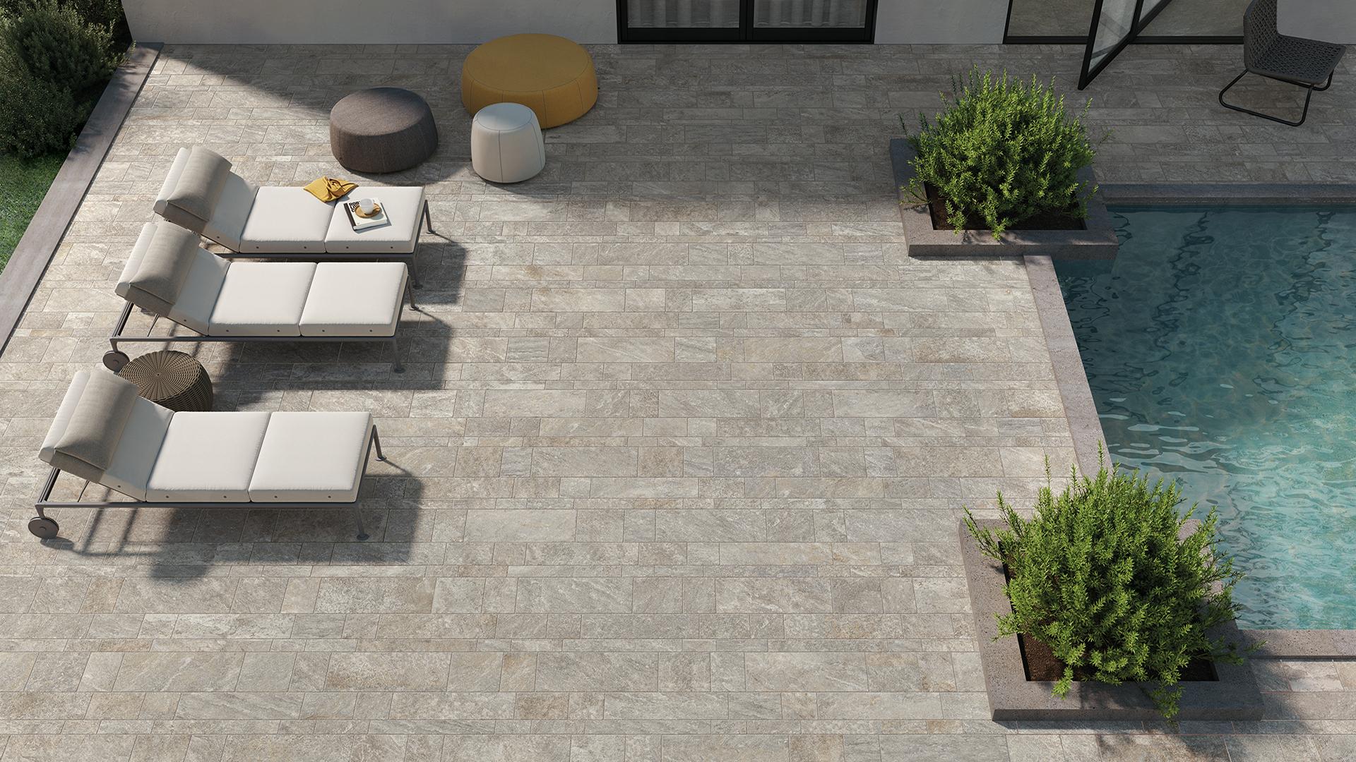 Der perfekte rutschfeste Bodenbelag für den Außenbereich muss hohe Leistung mit Ästhetik verbinden. Die von Quarzit inspirierte und in sechs Farben erhältliche Kollektion Oros Stone by Ergon interpretiert Naturstein in einem vielfältigen und designintensiven Katalog neu. Die rutschfesten Bodenplatten mit Rutschhemmsicherheit R10 und R11 sind sowohl für den Innen- als auch für den Außenbereich geeignet: Sie verleihen dem Raum Helligkeit und ein natürliches, modernes Gefühl und nutzen immer neue Schattierungen, Volumen und Lichtspiele. Die Gestaltung des Außenbereichs findet ihren ultimativen Ausdruck in Verbindung mit einem außergewöhnlich belastbaren und witterungsbeständigen Material.