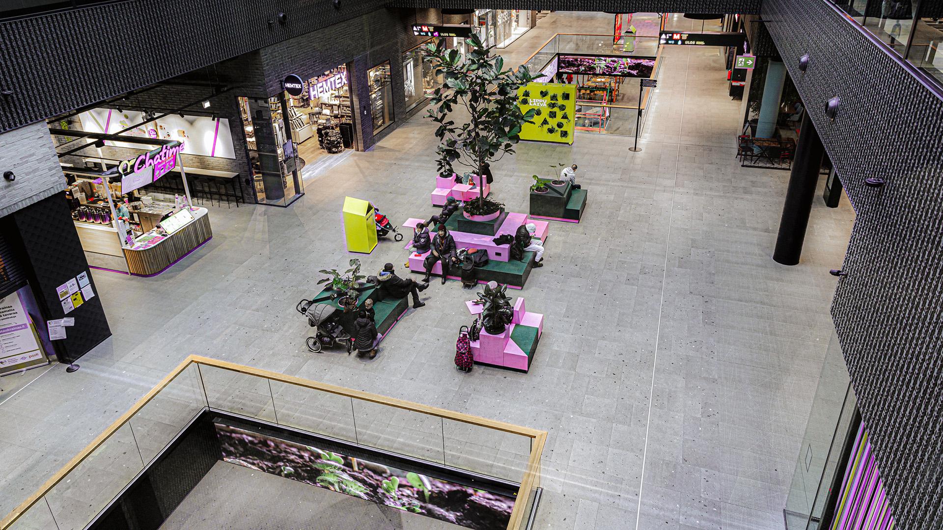 Das Einkaufszentrum hat drei Etagen, jede mit ihrer eigenen Fliesenfarbe. Dies erleichtert die Orientierung innerhalb des Einkaufszentrums. Das Muster des Bodenbelags verläuft von einem eher dunklen Ton im Untergeschoss zu helleren Tönen in den höheren Etagen.
