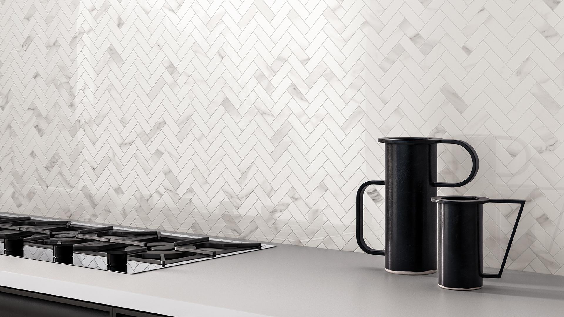 Ein optimales Beispiel zur Herstellung einer vielseitigen, widerstandsfähigen und ästhetisch vollkommenen Küchenarbeitsplatte in Marmoroptik sind die Riemchen im Verlegemuster „Battuto di Listelli“ der in der Farbe Quarzo Kandinsky verfügbaren Marmorvariante von Tele di Marmo Reloaded. Kennzeichnend ist hierbei die akkurate Verlegung im Mörtelbett von Steinchen oder Stäbchen, die der Küchenarbeitsplatte ein modernes, ungewöhnliches und dynamisches Aussehen verleiht und den eher klassischen Stil von Marmor spielerisch gestaltet.