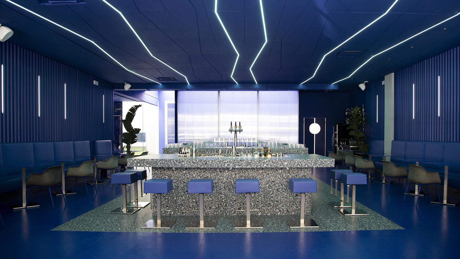 Bei der Gestaltung eines Gastronomieprojekts ist Einfarbigkeit als gestalterische Vorgabe sicherlich eine Herausforderung. Genauer gesagt handelt es sich dabei um das Blau von Yves Klein, als Hommage an den berühmten Künstler. Dieses Blau ist eine sehr intensive, ausdrucksstarke Farbe, energisch und zugleich umhüllend, die in vollendeter Weise die Persönlichkeit des Lokals und das Look & Feel verkörpert, um das es uns bei der Gestaltung ging. Wir wollten, dass in den Menschen das Gefühl entsteht, in eine Parallelwelt einzutauchen; daher haben wir für jede Wand, jede Oberfläche und jedes Einrichtungsobjekt eine einzige blaue Farbnuance verwendet, wobei wir den Rest der Atmosphäre dann dem Licht, den Schatten und der Perspektive überlassen haben. Außerdem wird die Farbe Blau sehr selten in der Gastronomie eingesetzt, weshalb diese Farbe zu einem weiteren, unverwechselbaren Erkennungsmerkmal des Lokals wird.