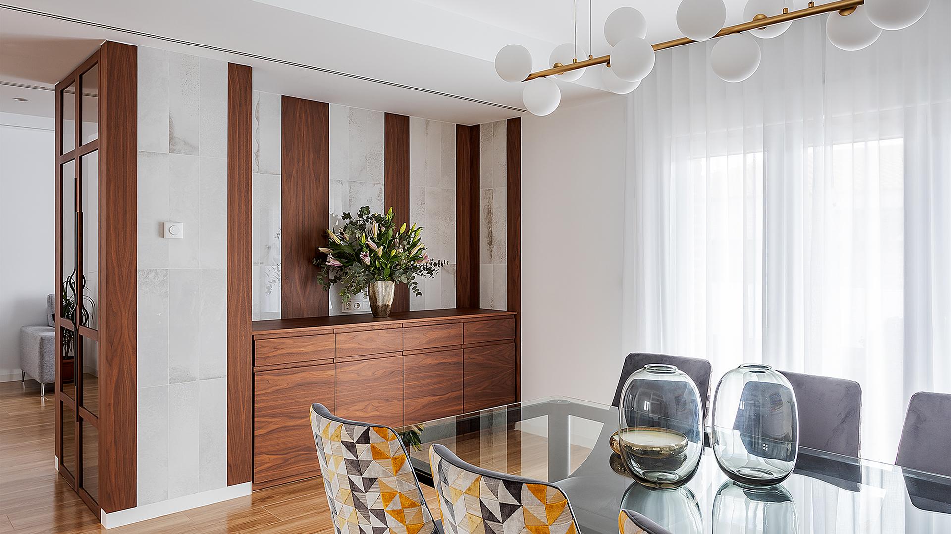 Die Kollektion, die sich perfekt in den Kontext fügt, wurde vom Architekten Raúl Lorente auf ungewöhnliche Weise eingesetzt. Er verlegte das Format 30x60 cm in der Farbe Perla senkrecht an der Trennwand zwischen Wohnzimmer und Esszimmer. Elegante Holzdekore erzeugen einen stimmigen Mix und bringen die reizvollen Spiegeleffekte der Kollektion Narciso zur Geltung.