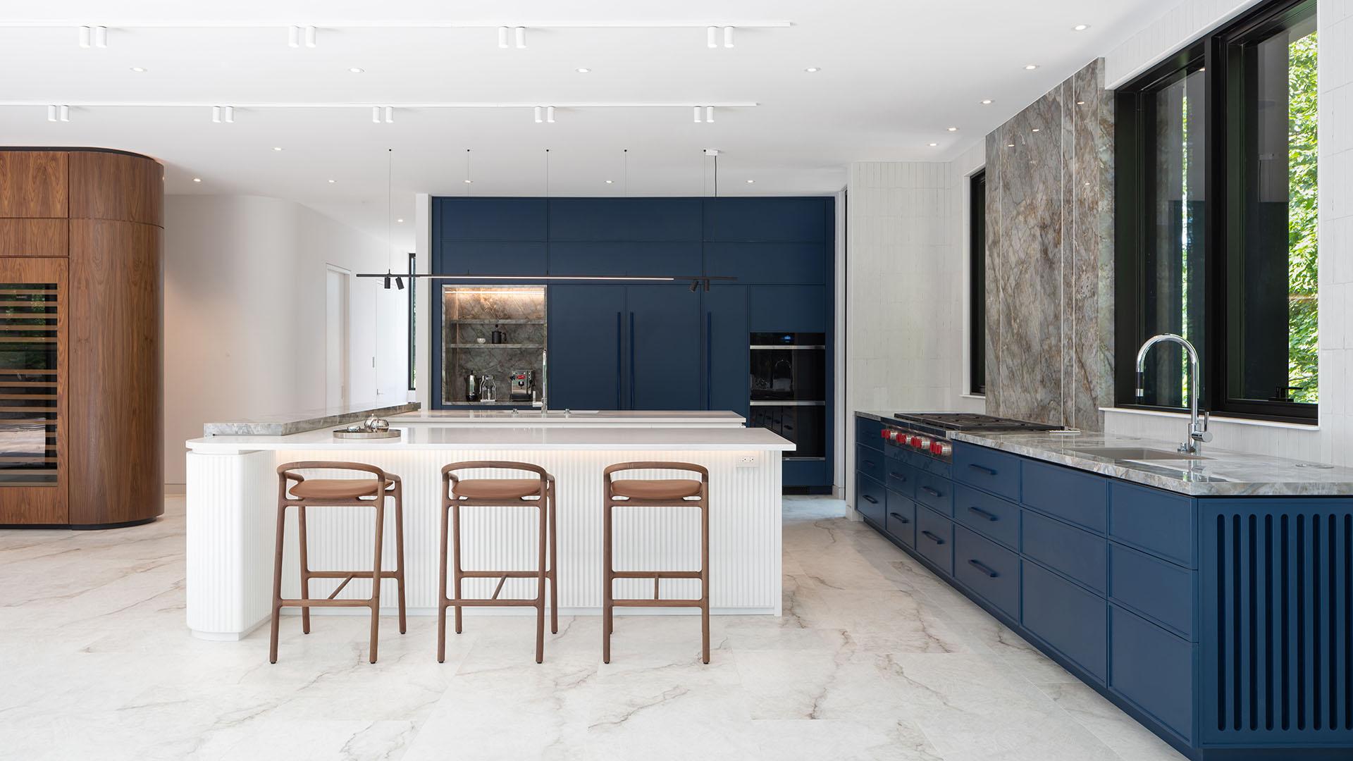 Die Kollektion Tele di Marmo Reloaded by Emilceramica in der Farbe Quarzo Kandinsky verbindet stimmig die Räume - vom Wohnzimmer über Flure und Bäder bis hin zur Küche - und sorgt für stilistische und visuelle Balance. In der Küche kommt außerdem die Farbe Blu Ande aus der Kollektion Tele di Marmo Revolution by Emilceramica zum Einsatz, deren besondere Äderungen dem Raum Tiefe und einen wertigen Touch verleihen.