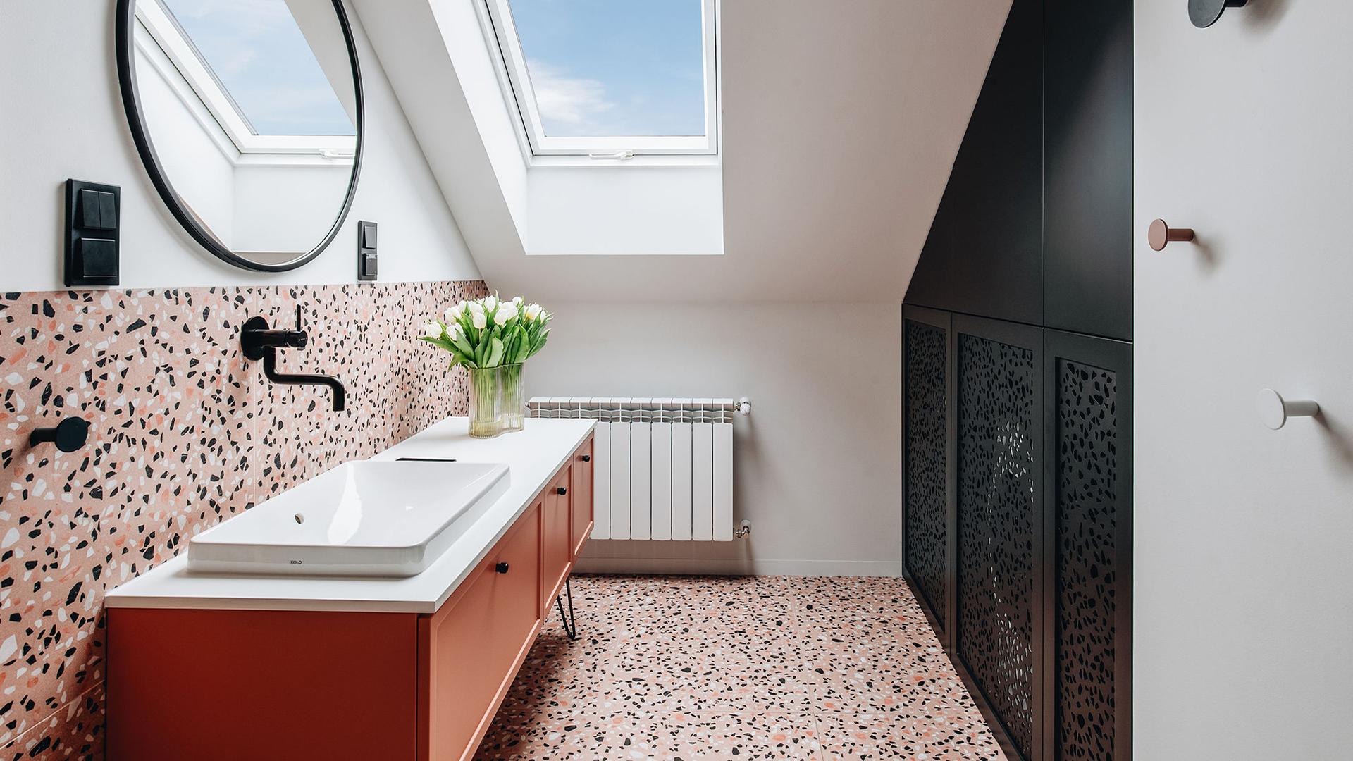 Aufgrund seiner besonderen Lage unter einer Dachschräge stellte dieses Bad eine besondere Herausforderung dar, die die Architektin Aleksandra Andrejkow vom Studio FORMAlinia kreativ meisterte. Mit dem rosa Farbton der Kollektion Medley by Ergon in den verschiedenen Ausführungen Minimal, Rock und Classic gelang es ihr, ein einladendes und natürlich wirkendes Ambiente zu schaffen.