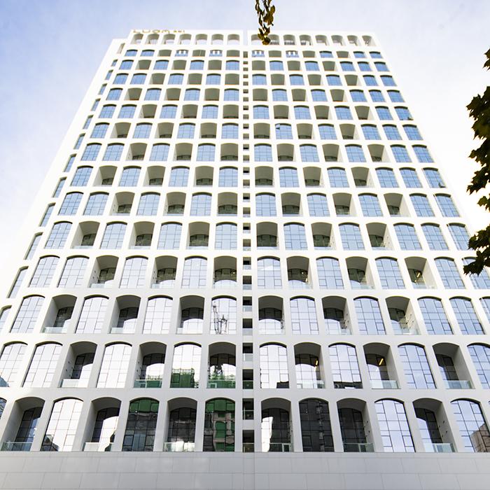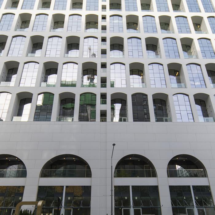 Im Mittelpunkt des Projekts stehen die 6,5 mm starken großformatigen Platten Level im Format 160x320 cm, die insgesamt 34.000 m² Fassadenfläche bekleiden. Die puristische, schlichte Farbe White der Platten Level Tinta Unita betont den monumentalen Charakter des Gebäudes und seine zeitgemäße Identität durch die Verbindung von moderner Ästhetik, ausgezeichneten Leistungsmerkmalen und visueller Leichtigkeit.