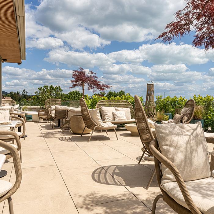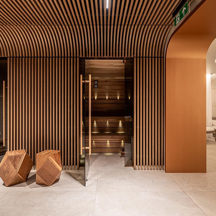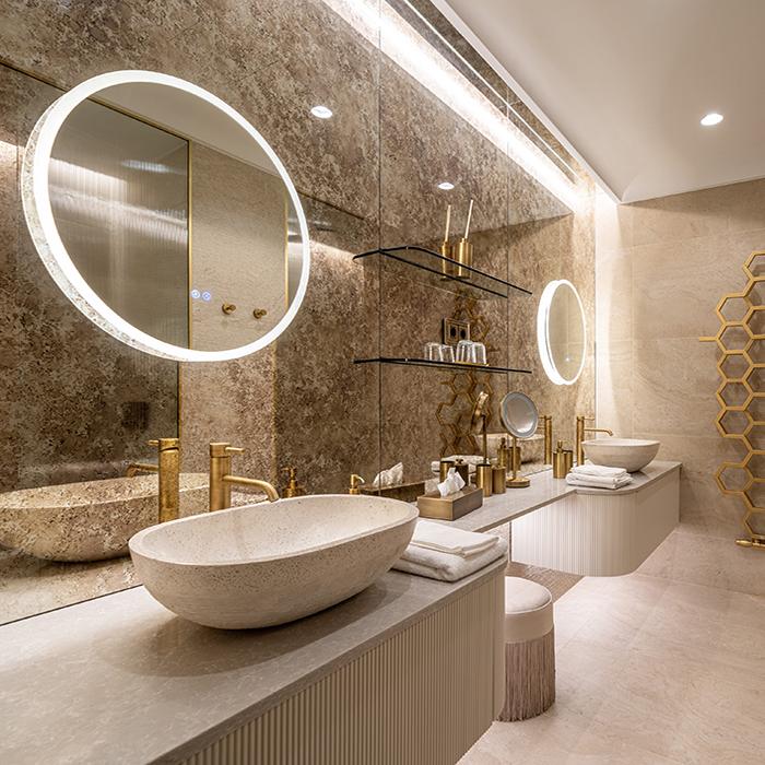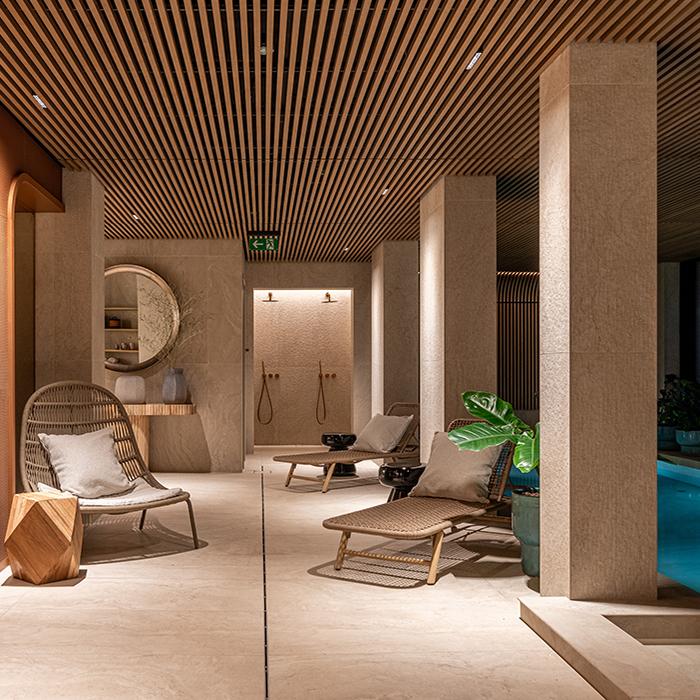 Unique Travertine by Provenza interpretiert diesen Dialog zwischen Vergangenheit und Gegenwart durch die Verbindung der klassischen Materialsprache von Travertin mit der Eleganz von modernem Design. Die Kollektion, eingesetzt im Format 60x120 und in den Versionen Minimal Cream und Ruled Cream, kommt in den Wellnessbereichen und auf der Rooftop-Terrasse zur Anwendung, wo sie ein elegantes Ambiente im Dialog mit der historischen Gebäudesubstanz erschafft. In den Bädern der Hotelsuiten erhält die Materialpalette durch die Farbe Minimal Chocolate eine weitere Ergänzung, die dank warmer, eleganter Kontraste eine wertige Note in den Privaträumen setzt.